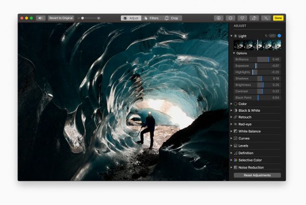 - Fotoritocco: Oltre a catalogare e ritrovare rapidamente una foto tra decine di migliaia, l’app è dotata di strumenti per perfezionare e rendere davvero unici gli scatti. Per visualizzare le opzioni di fotoritoco, è sufficiente fare doppio clic su un’immagine, quindi selezionare Modifica in alto a destra. Si può migliorare i colori, l’esposizione, aggiungere testo o Emoji, e infine apporre una firma. La funzione Migliora, invece, regola automaticamente i valori dell’immagine con un solo clic (dalla Luce, ai Colori, dal Bilanciamento bianchi alle Curve dei Livelli, compresa la Definizione)