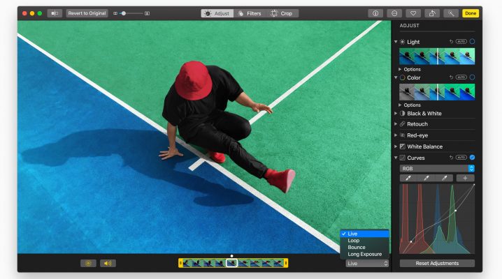 L’app Foto nasce nell’ecosistema Apple per l’ecosistema Apple, e dunque supporta tutte le feature e le tecnologie dei dispositivi e computer di Cupertino. Un esempio sono le Live Photo che scattate da tutti gli iPhone più recenti incluso iPhone 11; possono essere modificate e rese davvero speciali con gli effetti Loop (ripete continuamente), Rimbalzo (ripete continuamente dal principio alla fine, e viceversa), e Esposizione Lunga (trasforma una Live Photo in un’immagine a esposizione lunga, come se aveste una reflex digitale). In più potete ritagliare le Live Photo, azzerarne l’audio o modificare il fotogramma chiave.