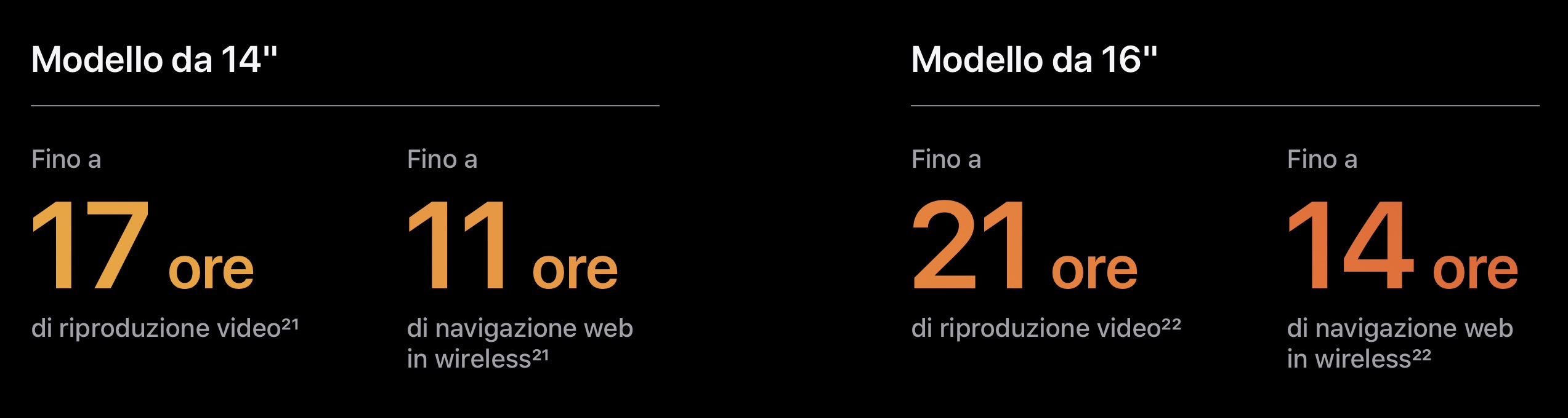 Le risoluzioni sono quindi di 3024×1964 (5,9 milioni di pixel a 254 ppi) per il MacBook Pro 14,2″ e di 3456×2234 (7,7 milioni di pixel a 254 ppi) per il 16,2″.