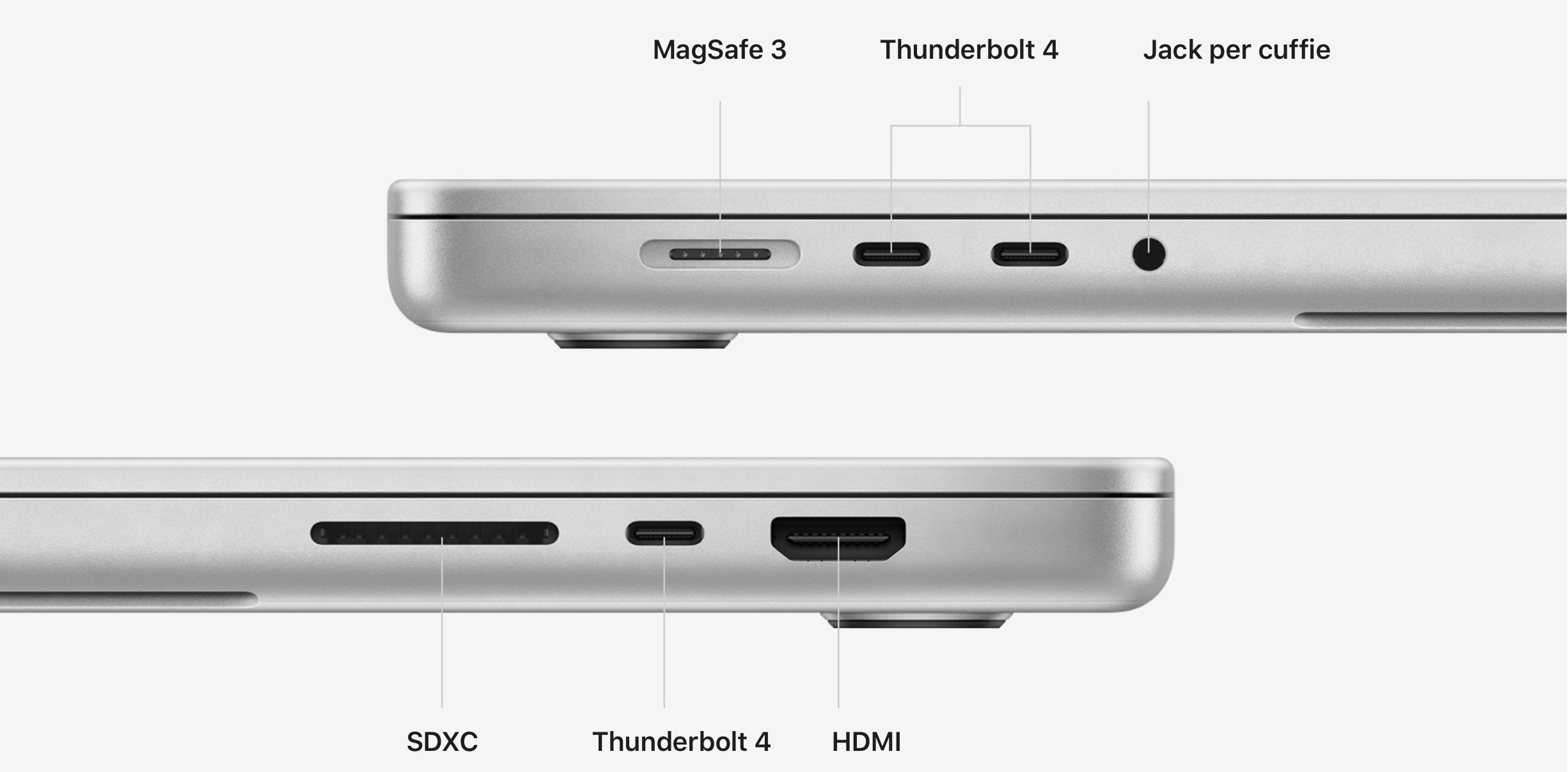 Il nuovo MacBook Pro offre moltissime opzioni di connettività per accontentare le esigenze di tutti; dimenticate la selva di dongle e adattatori che caratterizzavano l’esperienza del MacBook Pro fino ad oggi; sia il MacBook Pro 14″ che 16″ hanno tre porte Thunderbolt 4, uno slot per schede SDXC, una porta HDMI, un jack per cuffie ottimizzato che supporta ora cuffie ad alta impedenza. MagSafe torna su MacBook Pro con MagSafe 3, ora con un design rinnovato e supporto per una maggiore potenza. Con MagSafe 3, anche se si inciampa e si strattona il cavo di ricarica, il Mac resta al suo post perché l’aggancio è magnetico; tra l’altro, il nuovo MagSafe 3 può portare la batteria fino al 50% in appena 30 minuti, usando un caricabatterie da almeno 96W.