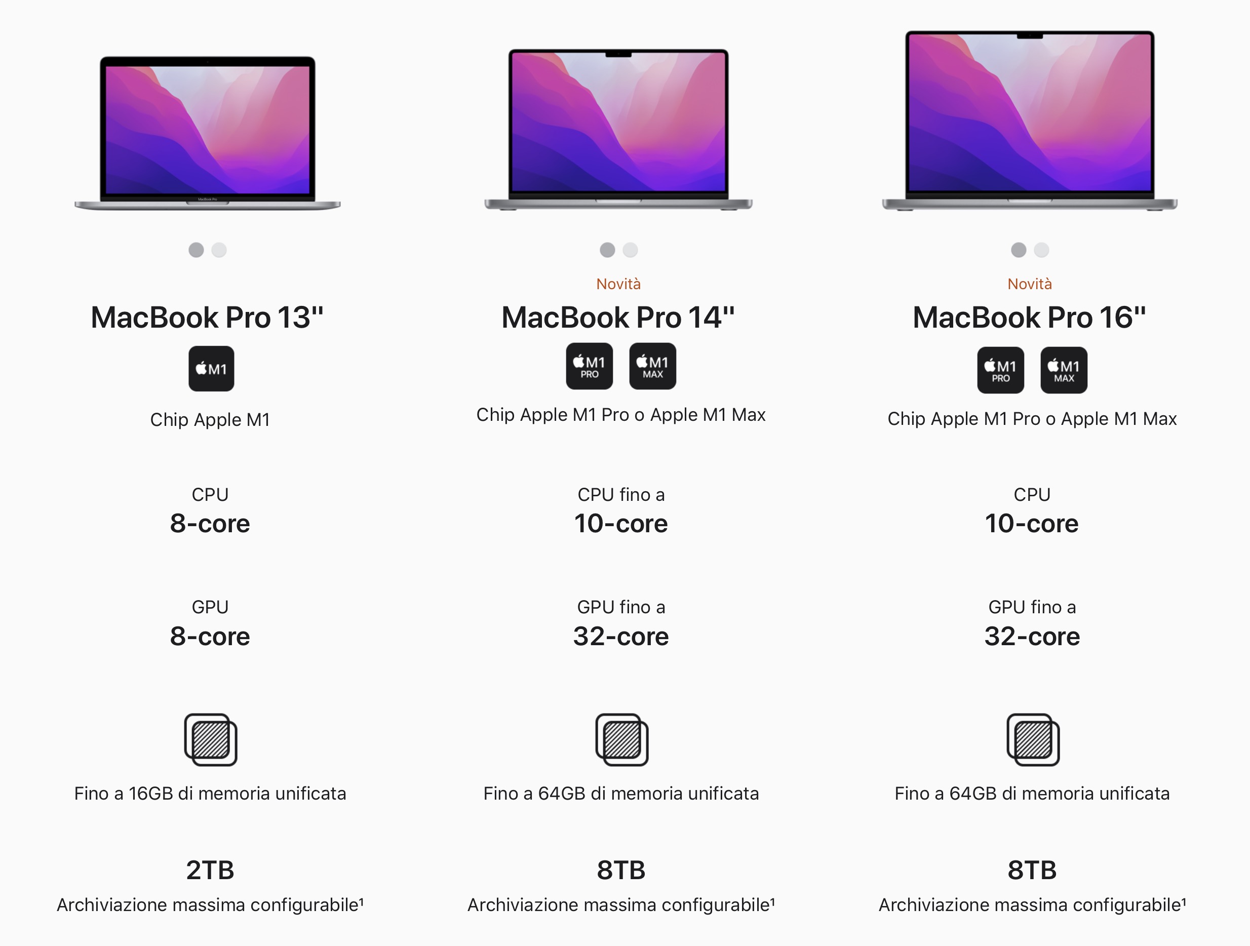 • MacBook Pro 14″: CPU 10‑core, GPU 16‑core, 16GB di memoria unificata, Archiviazione SSD da 1TB a 2.849€.