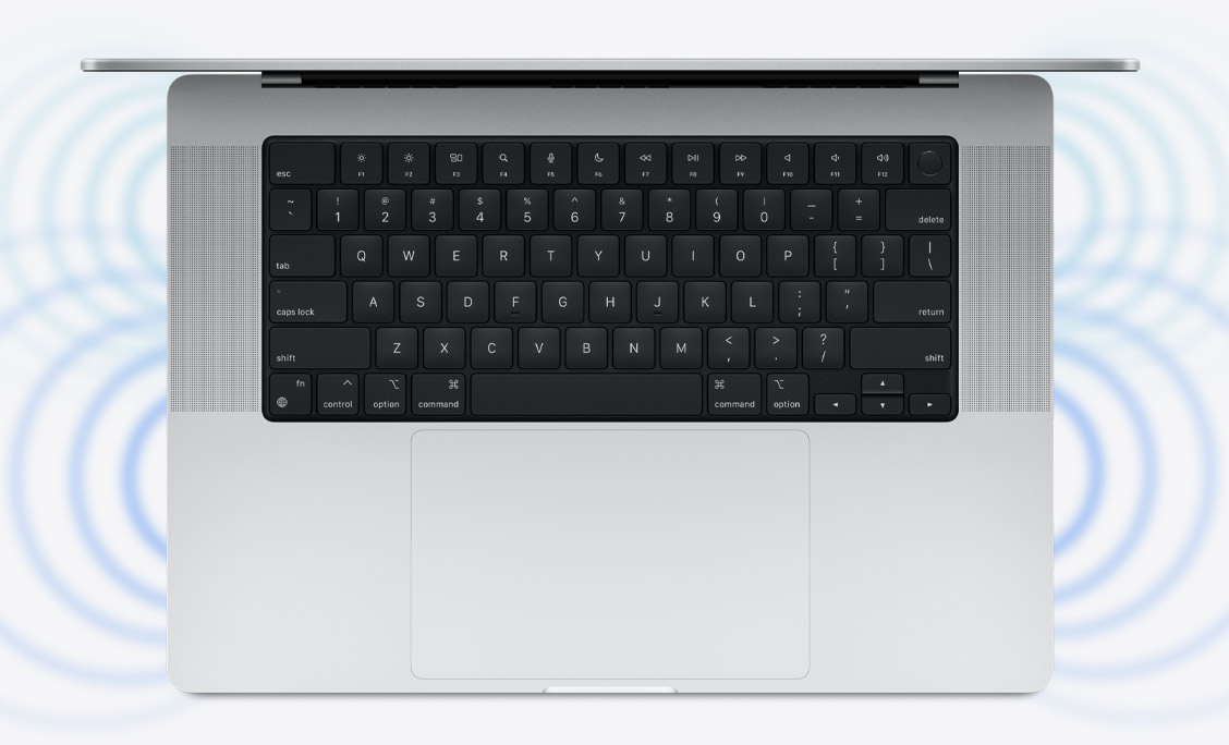 Il nuovo MacBook Pro integra tre microfoni di qualità professionale con un rumore di fondo bassissimo; e i tre microfoni in array sfruttano il beamforming direzionale per far sì che la voce arrivi sempre forte e chiara. Il sistema audio invece è composto da sei altoparlanti ad alta fedeltà composto da due tweeter  equattro woofer force-cancelling, per l’80% di bassi in più. Il sistema supporta inoltre l’Audio Spaziale, che crea l’illusione del suono surround con supporto a Dolby Atmos.