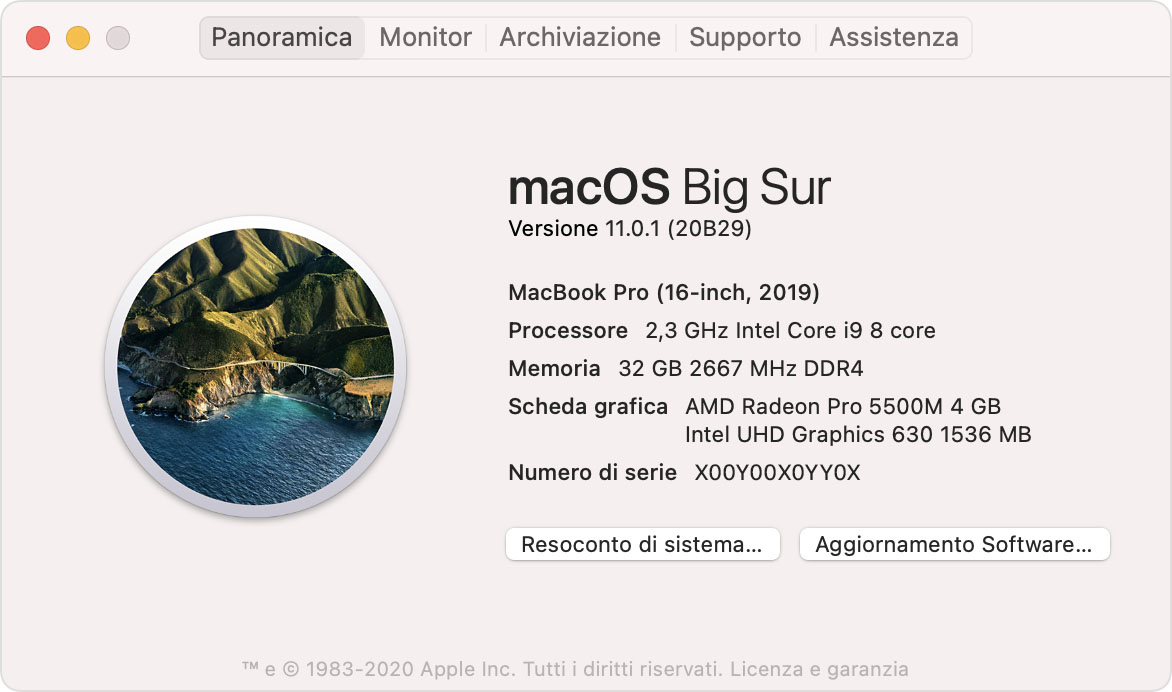 Per identificare il modello di Mac che possiedi, è sufficiente selezionare il menu Apple () nell’angolo dello schermo, e fare clic su Informazioni su questo Mac. Dovrebbe comparire una panoramica del computer che include il nome del modello e il numero di serie.