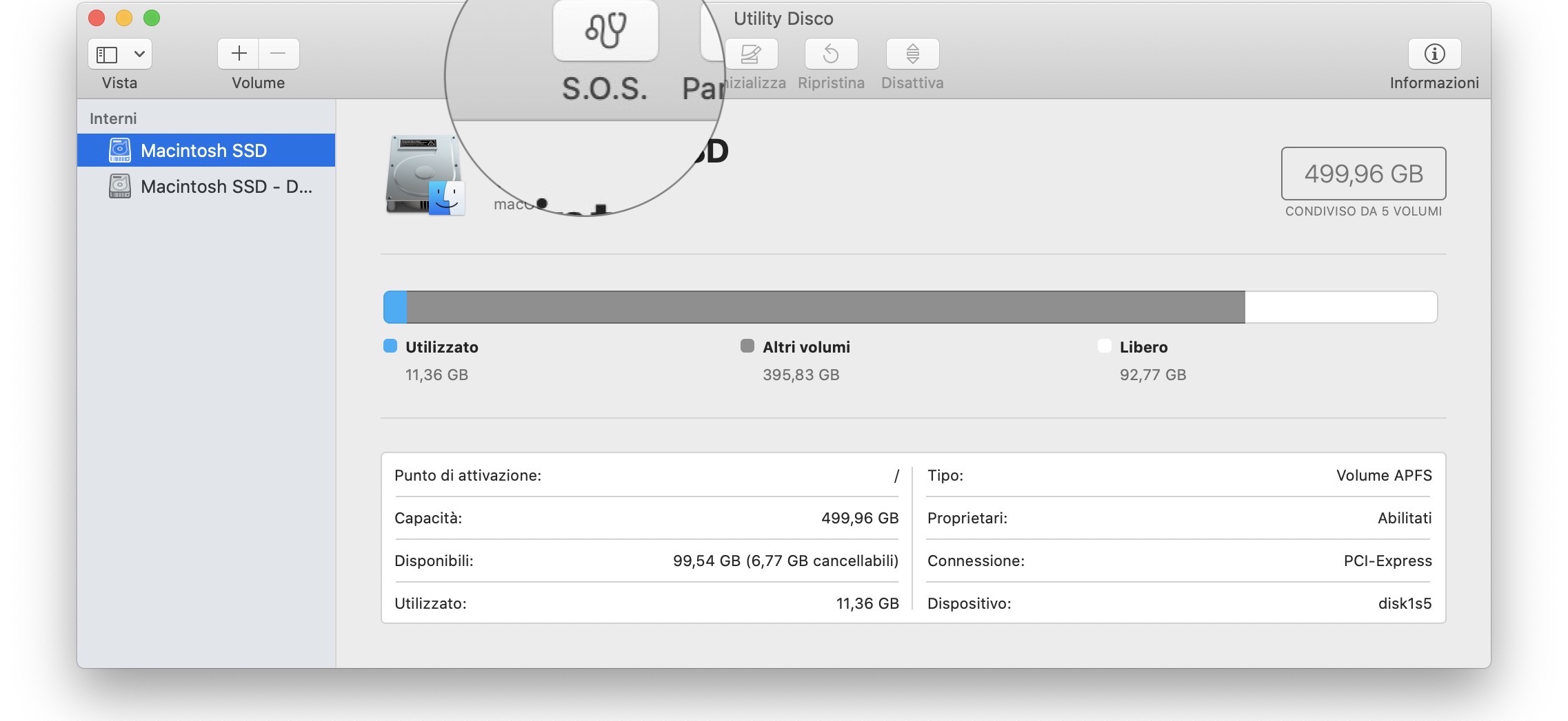 Un’installazione può andare rovinosamente male se ci sono errori su disco. Per fortuna, è molto facile verificare che sia tutto a posto. Basta aprire Utility Disco che trovi nella cartella Applicazioni → Utility nel Finder, selezionare il “Macintosh HD” sulla sinistra e infine premere il pulsante di S.O.S. in alto.