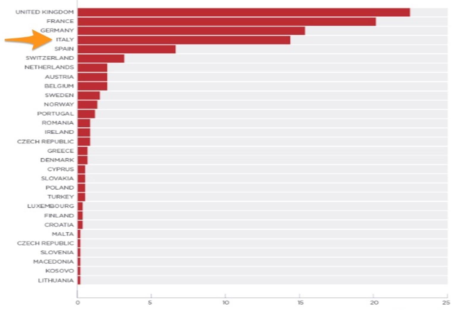 E tra i paesi più colpiti ci sono Regno Unito, Francia e Germania e purtroppo anche Italia; quest’ultima si attesta al quarto posto, con numeri assolutamente sovrapponibili a quelli della Germania.