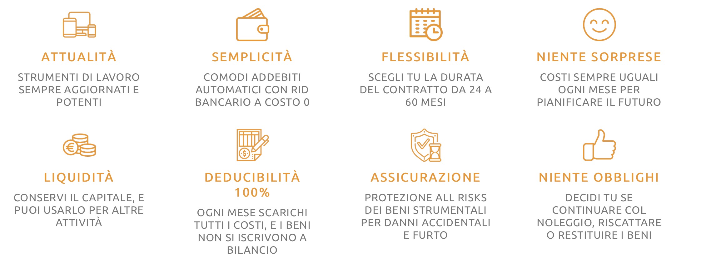 • Vantaggi Economici: In luogo di un oneroso investimento iniziale, ripartisci la spesa in piccoli addebiti periodici. Non serve indebitarsi con la banca, e soprattutto salvaguardi la liquidità personale/aziendale.
