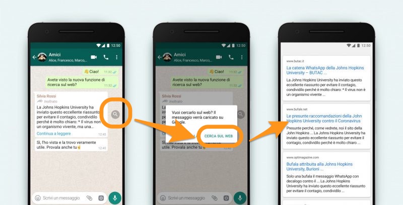 Quando si riceve un messaggio potenzialmente bufalino, WhatsApp porrà l’icona di una lente di ingrandimento alla sua destra. Per verificare la notizia, basta fare così: